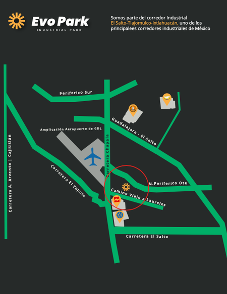 El proyecto y diseño urbano EVO PARK está desarrollado en un terreno con una superficie total de 20,000 m2. en el hub aeroportuario ubicado en Tlajomulco de Zúñiga, Jal.